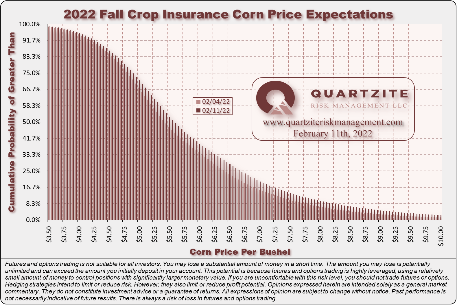 We have done some hedging for our Quartzite Precision Marketing customers for the 2022 season. We continue to recommend cash contracting portions of 2022 production as producers book inputs. This week, we made a few trades for our Quartzite Precision Marketing customers. On Thursday, we purchased a small number of near-the-money Dec22 put options. After the PBS story we mentioned above broke Friday afternoon, we bought some short-dated March call options. We later sold half of this position out at levels that covered the entire initial purchase - leaving the second half as a short-term hedge against developments in Ukraine into next week. Despite the uptrend in Dec22 corn futures and geopolitical risk, we continue to believe that producers should protect their investment in expensive inputs with a disciplined and flexible risk management strategy. There is still time to consider your 2022 marketing plan. If you have any questions or want to learn more about what we do, please reach out. We are always happy to chat about the markets, and there is no obligation.