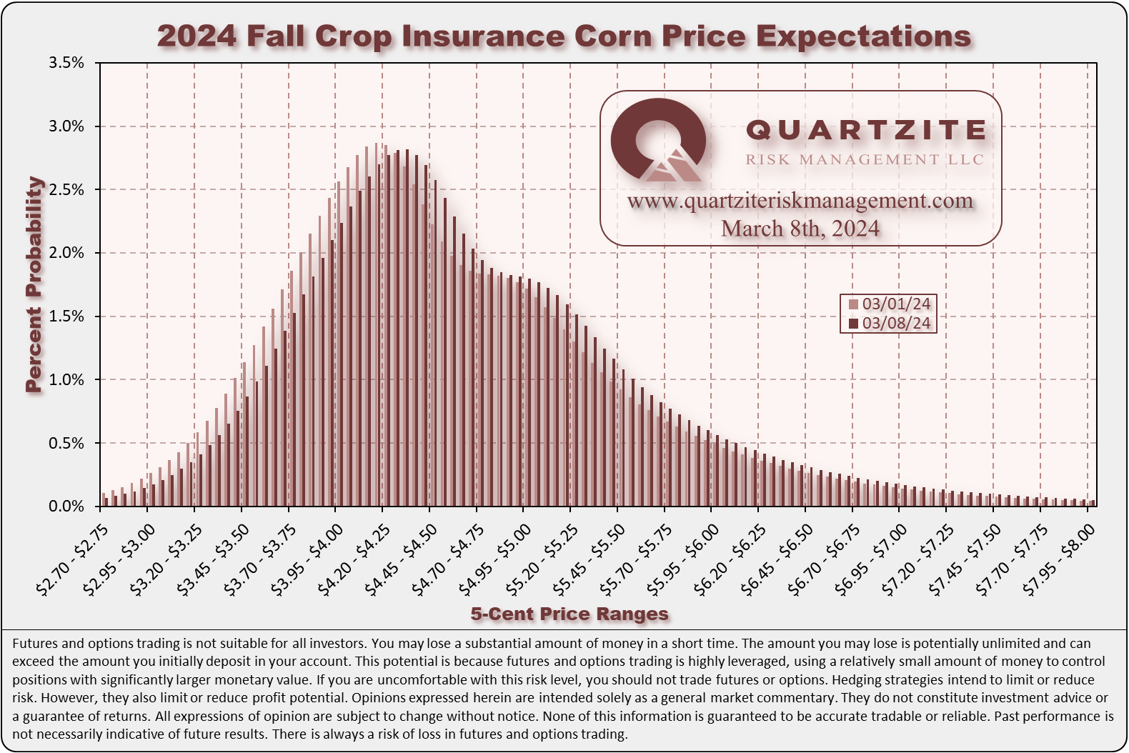 For the fall crop insurance price, we see a median of $4.5300/bushel with a mode between $4.30 and $4.35/bushel. See the crop insurance charts below.
