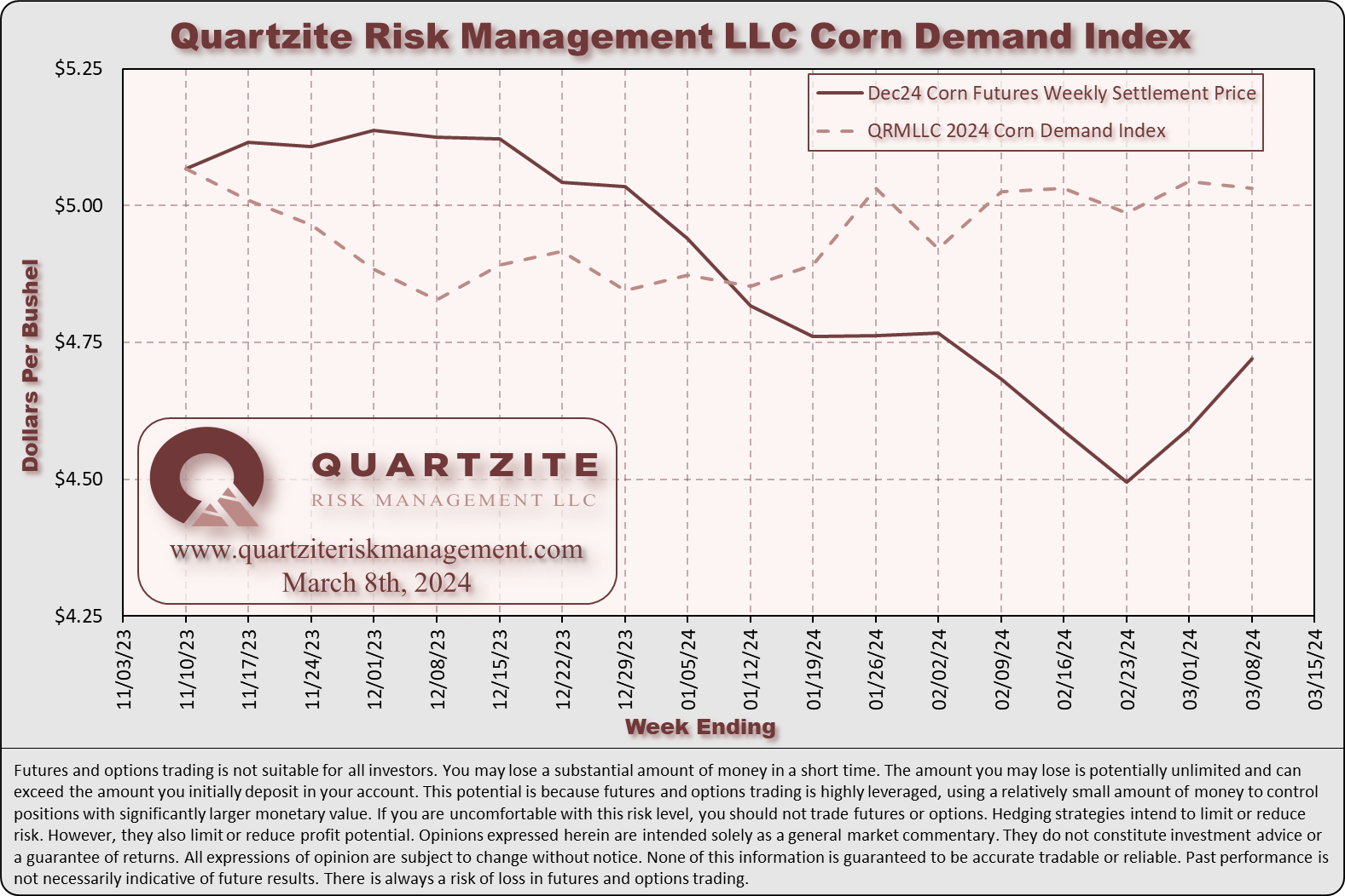 As a reminder, the Quartzite Risk Management Corn Demand Index references the weekly change in April 2025 futures for Crude Oil, Live Cattle and Lean Hogs. We weigh the percentage change in those contracts and compute the index's percentage change. Crude Oil accounts for 50% of the index, and Live Cattle and Lean Hogs each make up 25%. To create the chart, we started the index at the Dec24 corn futures settlement on 11/10/23; then added or subtracted the index's weekly percentage change. We want to add a few warnings. First, there are only a handful of data points - not much to go on. Second, the index references relatively illiquid markets - making any strategy based on it challenging to execute. Third, we expect divergences to increase as we get into the growing season when the corn market will likely look more toward supply for its direction. In short, we would not attempt to trade on this information without much more data, nor would we recommend anyone else does.