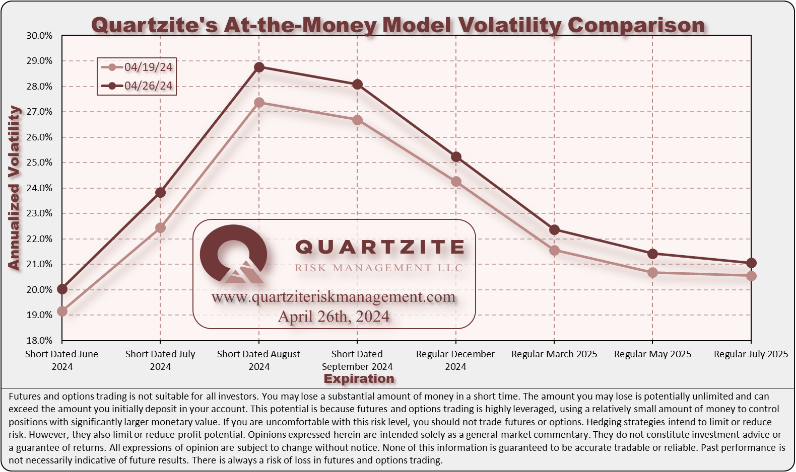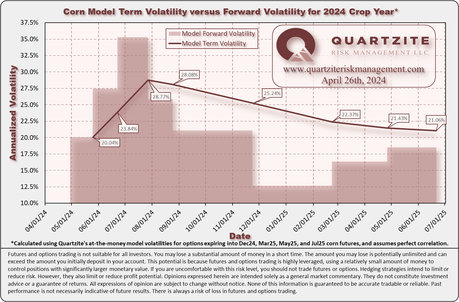 Our at-the-money model volatilities for the 2024 crop finished higher this week. We are opportunistically looking to add positions to our client portfolios. See the charts below for more details. One compares our closing at-the-money model volatilities for this week and last. The other compares our current model volatilities with the forward volatilities they imply between consecutive expirations.