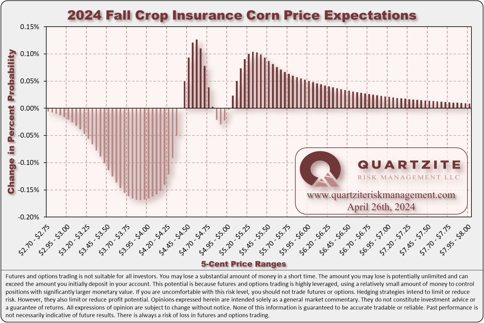 For the fall crop insurance price, we see a median of $4.5625/bushel with a mode between $4.30 and $4.35/bushel. See the crop insurance charts below.