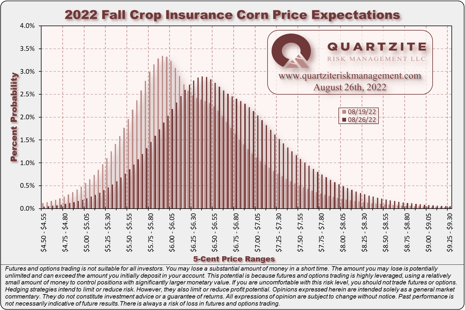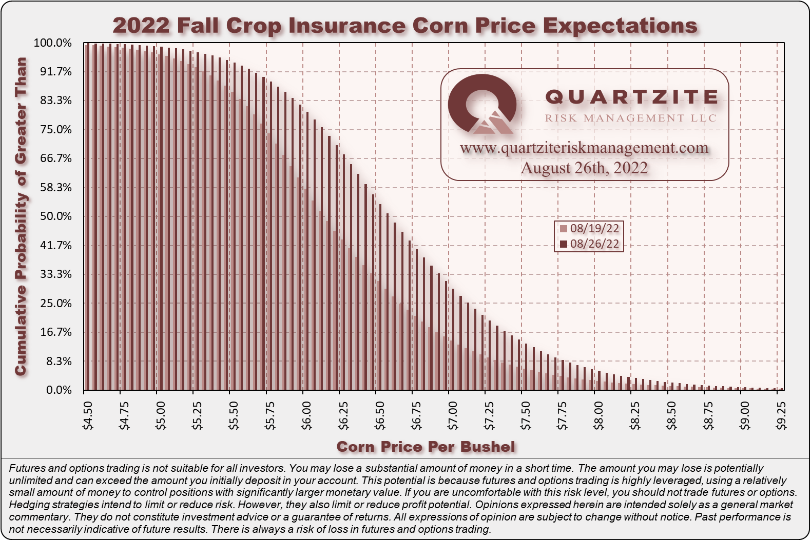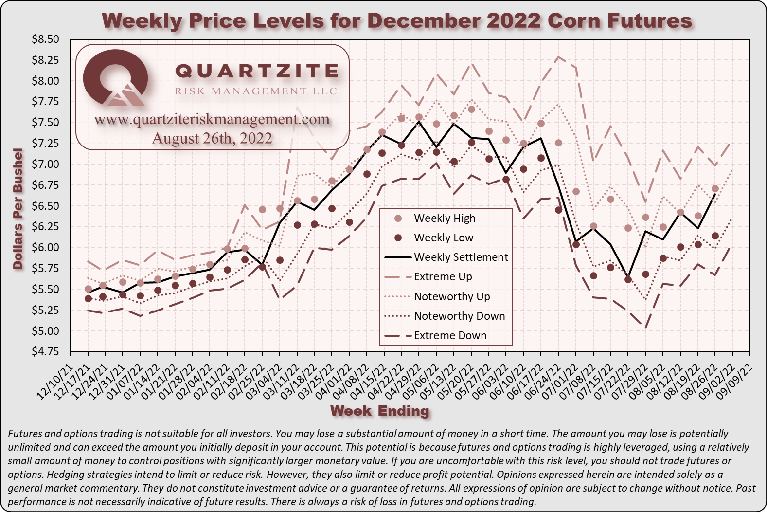This week, we were somewhat active in the new crop corn market for our Quartzite Precision Marketing customers. On Monday, we purchased some dollar-cheap, out-of-the-money calls in the Short-Dated September and September Week One expirations. On Tuesday, we rolled some out-of-the-money October puts up nearer to the money, as the Short-Dated September calls from Monday came into the money. Early Friday, as Powell's speech in Jackson Hole began to make headlines, we sold futures to offset our now in-the-money Short-Dated September calls. Due to the response of broad financial markets after Powell's speech, we used a portion of the gains from those calls to purchase some dollar-cheap Short-Dated September puts that expired later in the day. We still think producers should protect their investment with a disciplined and flexible risk management strategy like the one at the heart of Quartzite Precision Marketing. Now might be the right time to consider your 2023 marketing plan. If you have any questions or want to learn more about what we do, we are always happy to chat about the markets, and there is no obligation.