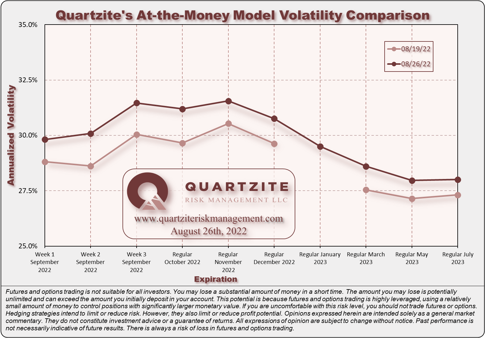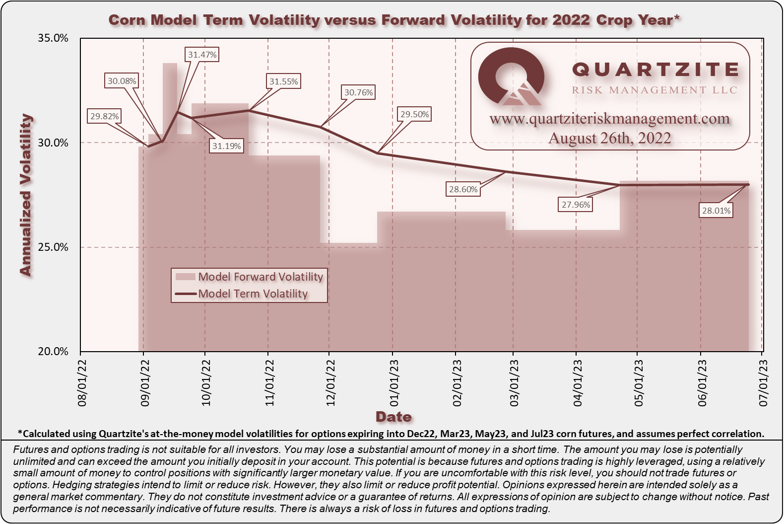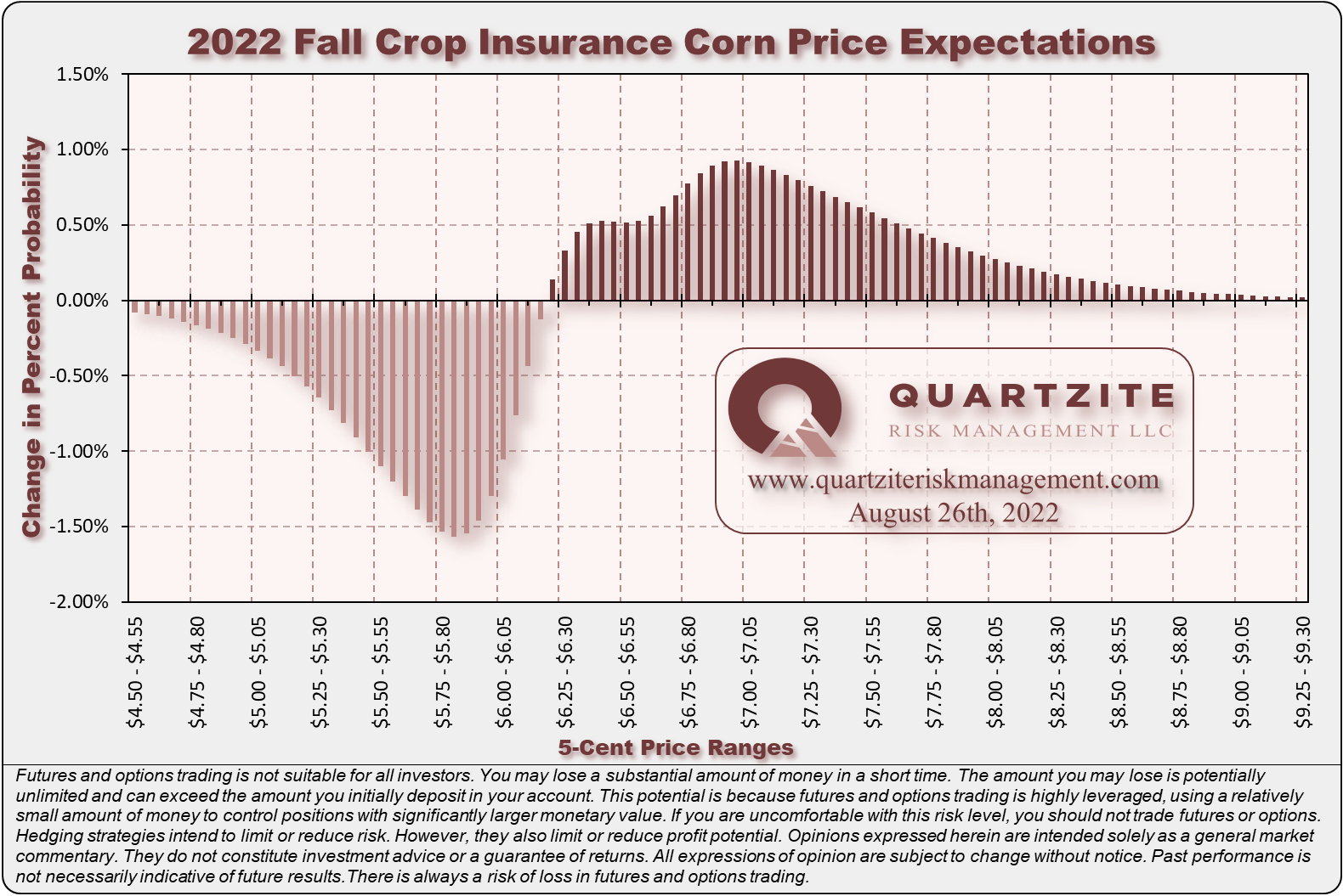 This week, we were somewhat active in the new crop corn market for our Quartzite Precision Marketing customers. On Monday, we purchased some dollar-cheap, out-of-the-money calls in the Short-Dated September and September Week One expirations. On Tuesday, we rolled some out-of-the-money October puts up nearer to the money, as the Short-Dated September calls from Monday came into the money. Early Friday, as Powell's speech in Jackson Hole began to make headlines, we sold futures to offset our now in-the-money Short-Dated September calls. Due to the response of broad financial markets after Powell's speech, we used a portion of the gains from those calls to purchase some dollar-cheap Short-Dated September puts that expired later in the day. We still think producers should protect their investment with a disciplined and flexible risk management strategy like the one at the heart of Quartzite Precision Marketing. Now might be the right time to consider your 2023 marketing plan. If you have any questions or want to learn more about what we do, we are always happy to chat about the markets, and there is no obligation.